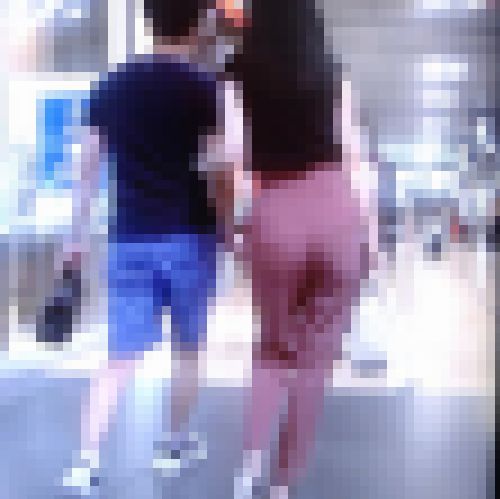 ハイウエストのピンクピタパンに調度いい位の大き目なお尻で美女がイチャつきながら歩いてます♪ピタパンから浮き出るエッチな線が際立つピンク色のパンツがイイ感じです♪