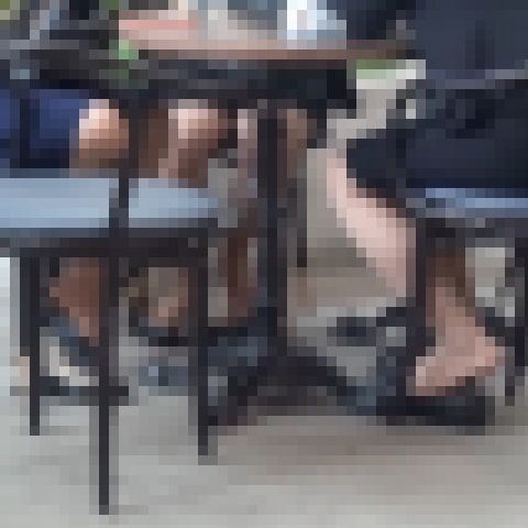 テラス席に座っているカップルです。女性はストラップ付きのパンプスを脱いでいて、テーブルの脚部分に足を乗せ、時には椅子に足を乗せてパンストのつま先を引っ張ったりしています。しばらくして店内のソファ席に座ると、片足はソファの…